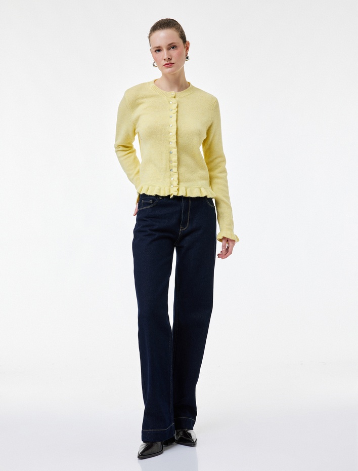 Bisiklet Yaka Düğmeli Fırfırlı Triko Hırka