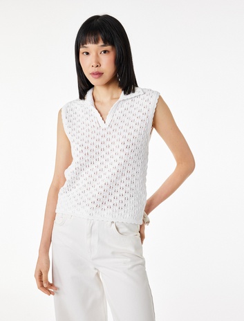 Boncuk İşlemeli Polo Yaka Pointelle Örgü Kolsuz Bluz
