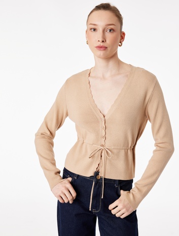 Belden Bağlama Detaylı Uzun Kollu Düğmeli V Yaka Triko Hırka