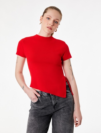{ "id": "8684848086635", "name": "Asimetrik Kesim Büzgülü Kısa Kollu Arkası Düğme Detaylı Dik Yaka Triko Tişört", "taxonomy":["CITY FASHION","CITY FASHION","WOMEN","KNITWEAR","SWEATERS"], "currency": "TRY", "unit_price": 1199.99 , "unit_sale_price": 1199.99 , "url": "https://www.koton.com/asimetrik-kesim-buzgulu-kisa-kollu-arkasi-dugme-detayli-dik-yaka-triko-tisort-kirmizi-4140448/", "stock": 39, "color": "KIRMIZI", "size": "L", "product_image_url": "https://ktnimg2.mncdn.com/products/2026/02/24/3198357/e5d5b932-473c-4a44-ac3b-4c750984e116_size870x1142.jpg" }