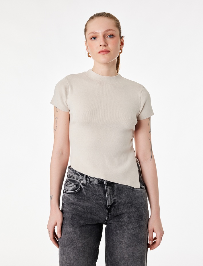 Asimetrik Kesim Büzgülü Kısa Kollu Arkası Düğme Detaylı Dik Yaka Triko Tişört Sepete Ekle
