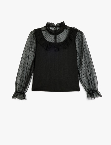 Kız Çocuk Bluz Balon Kollu Tül Detaylı Dik Yaka