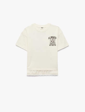 Pamuklu Kısa Kollu Bisiklet Yaka Dantel Detaylı Arkası Ayıcık Baskılı Tişört Sepete Ekle