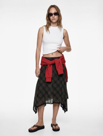 Normal Bel Asimetrik Kesim Tül Midi Ekoseli Etek Sepete Ekle