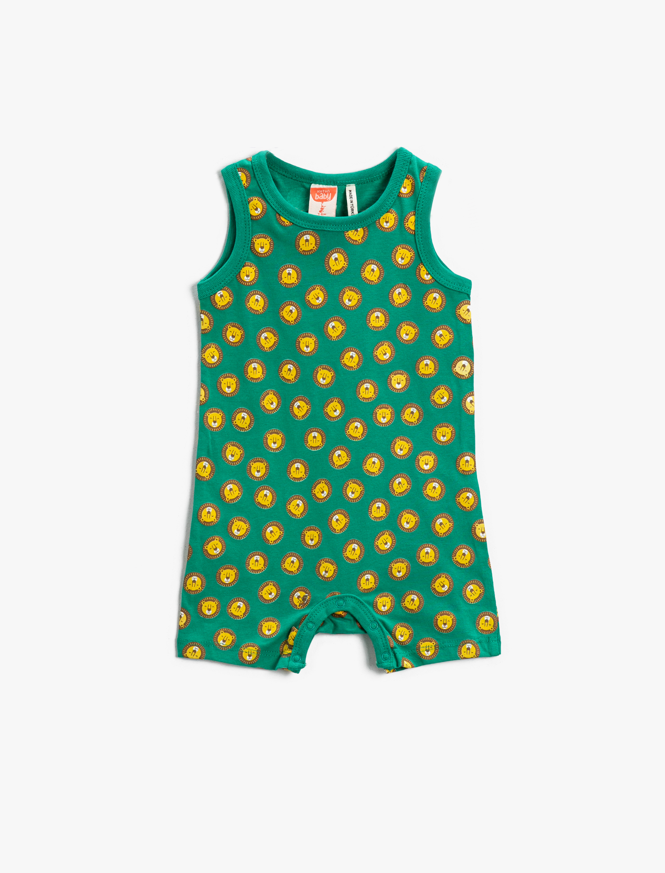 Kolsuz, çıt çıtlı, kısa, pamuklu, aslan baskılı tulum. Ürünlerimiz sağlığa zararlı kimyasallara karşı test edilmektedir. Ürünlerimizde bebeklerin yutabileceği küçük parçalar, tehlike oluşturabilecek ip ve kordonlar, keskin parçalar bulunmamaktadır.