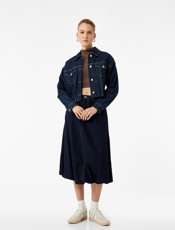 Pamuklu Cep Detaylı Midi Balon Denim Etek