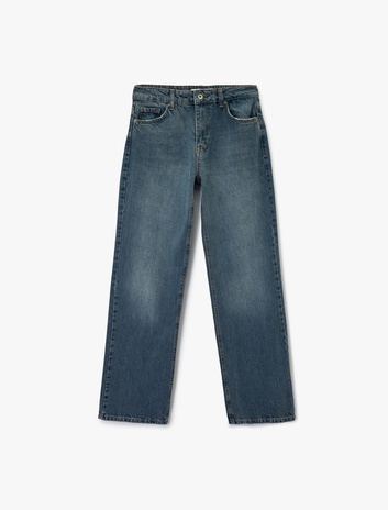 Düğmeli Normal Bel Cepli Düz Paça Taşlı Jean Pantolon - Straight Jeans Sepete Ekle