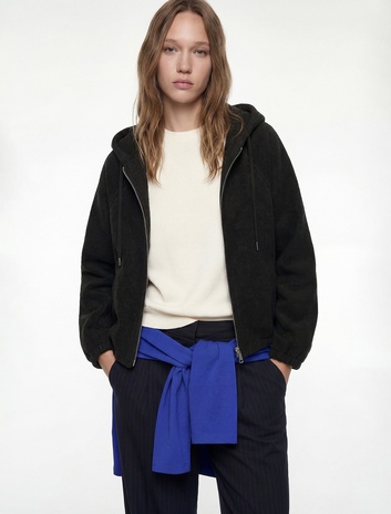 Cepli Fermuarlı Uzun Kollu Kapüşonlu Kaşe Bomber Ceket