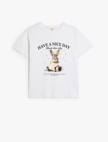 Tavşan Baskılı Bisiklet Yaka Kısa Kollu Pamuklu Tişört Sepete Ekle