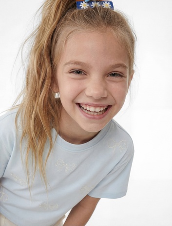 Kız Çocuk Sim Detaylı Bisiklet Yaka Kısa Kollu Pamuklu Tişört