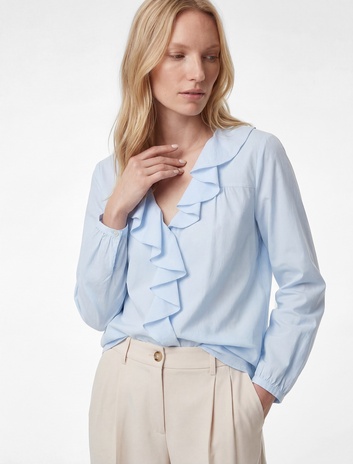 Volanlı Fırfırlı V Yaka Uzun Kollu Pamuklu Gömlek