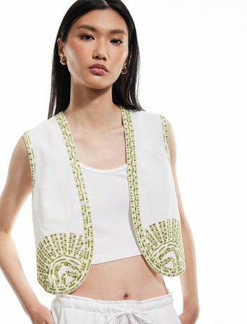Viskon-Pamuk Karışımlı Kolsuz Boncuk İşlemeli Yelek Sepete Ekle