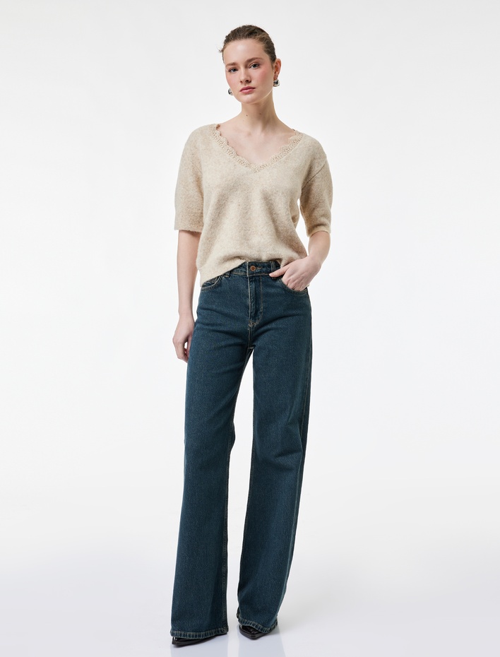 Koton X Şahika Ercümen - Kısa Kollu Dantel Detaylı V Yaka Triko Crop Kazak