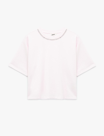 Pamuklu Kısa Kollu Bisiklet Yaka Taşlı Tişört Sepete Ekle