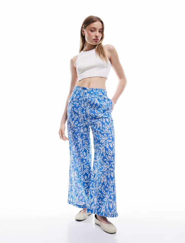 Düz Paça Düğmeli Çiçekli Uzun Pantolon