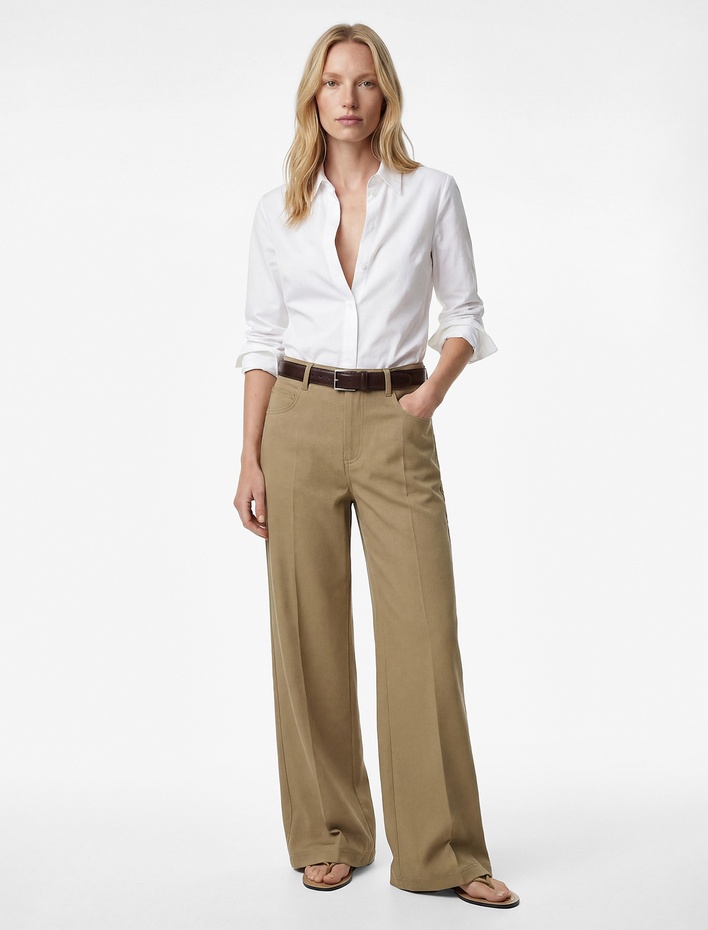 Aplike Cep Detaylı Geniş Paça Kemerli Kumaş Pantolon Sepete Ekle