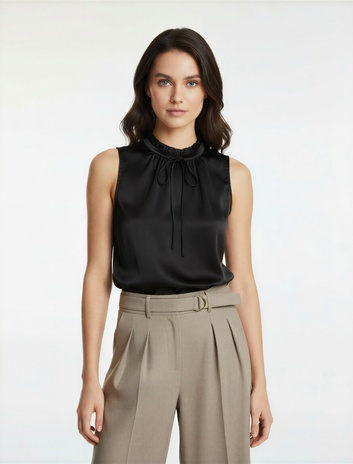 Bağlama Detaylı Dik Fırfırlı Yaka Kolsuz Gömlek