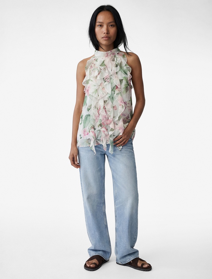 Kolsuz Halter Yaka Fırfırlı Çiçekli Şifon Bluz Sepete Ekle