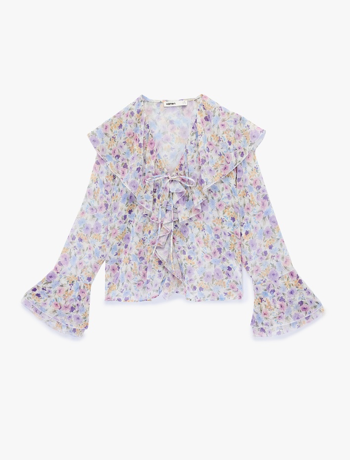 V Yaka Bağlama Detaylı Uzun İspanyol Kollu Fırfırlı Çiçekli Şifon Bluz Sepete Ekle