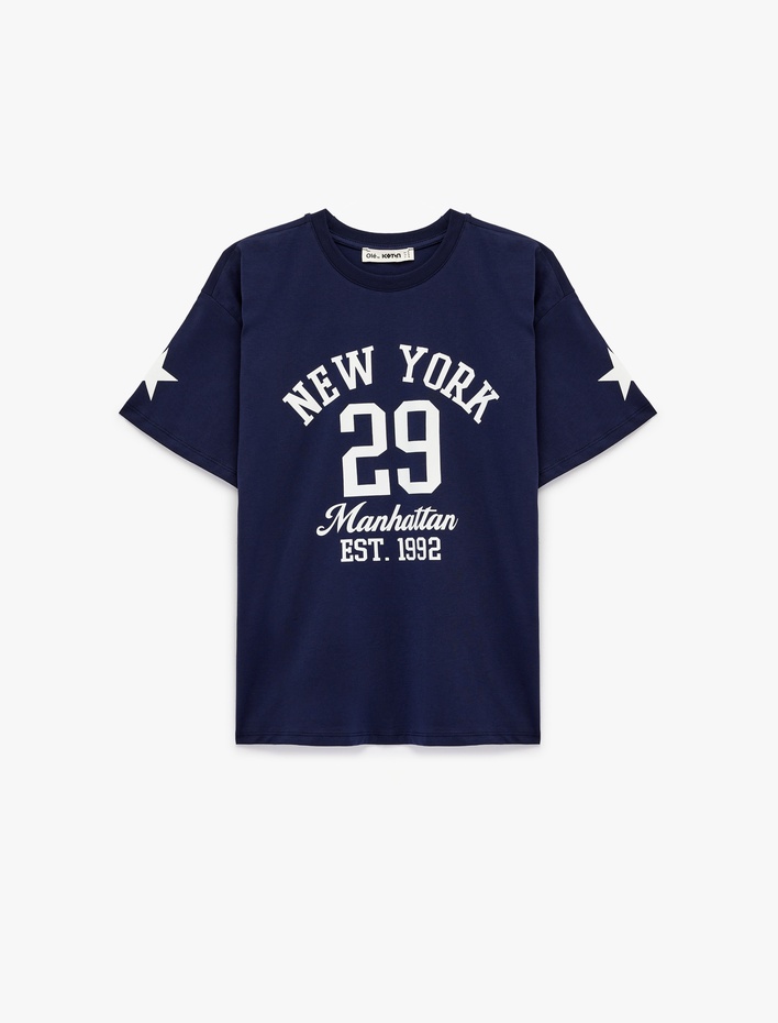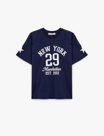 Rahat Kalıp Kısa Kollu Bisiklet Yaka Kolej Baskılı Tişört Sepete Ekle