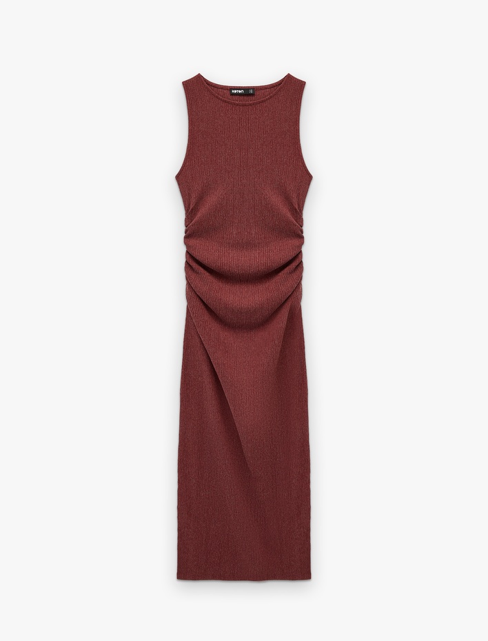 Bürümcük Kumaş Drape Detaylı Bisiklet Yaka Uzun Kalem Elbise Sepete Ekle