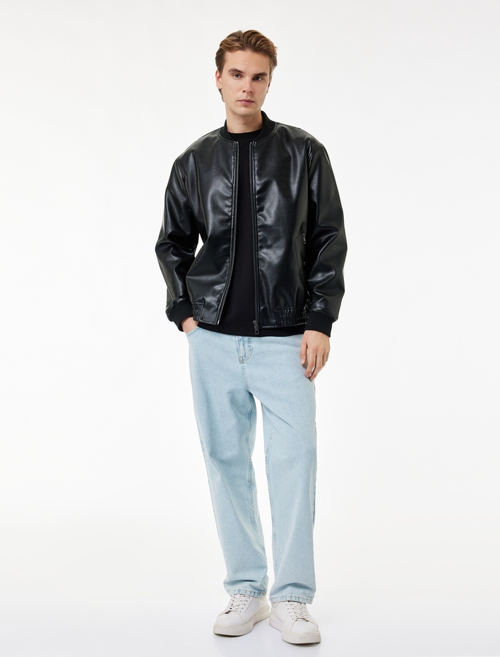 Regular Fit Fermuarlı Cepli Kolej Yaka Bomber Suni Deri Ceket Sepete Ekle