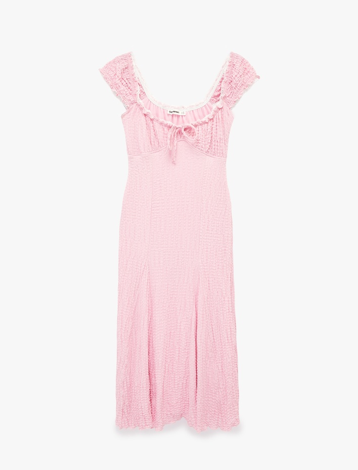 Kolsuz Bağcıklı U Yaka Bürümcük Dantel Detaylı Uzun Elbise Sepete Ekle