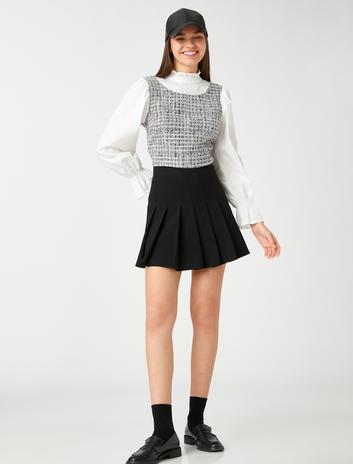 Kazayağı Desenli A Kesim Yüksek Bel Kemerli Tüvit Mini Etek Sepete Ekle