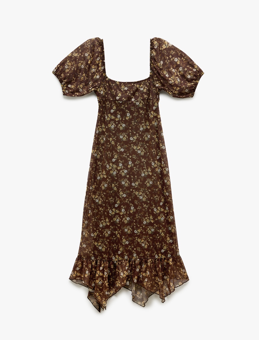 U Yaka Kısa Balon Kollu Yırtmaçlı Asimetrik Çiçekli Midi Tül Elbise