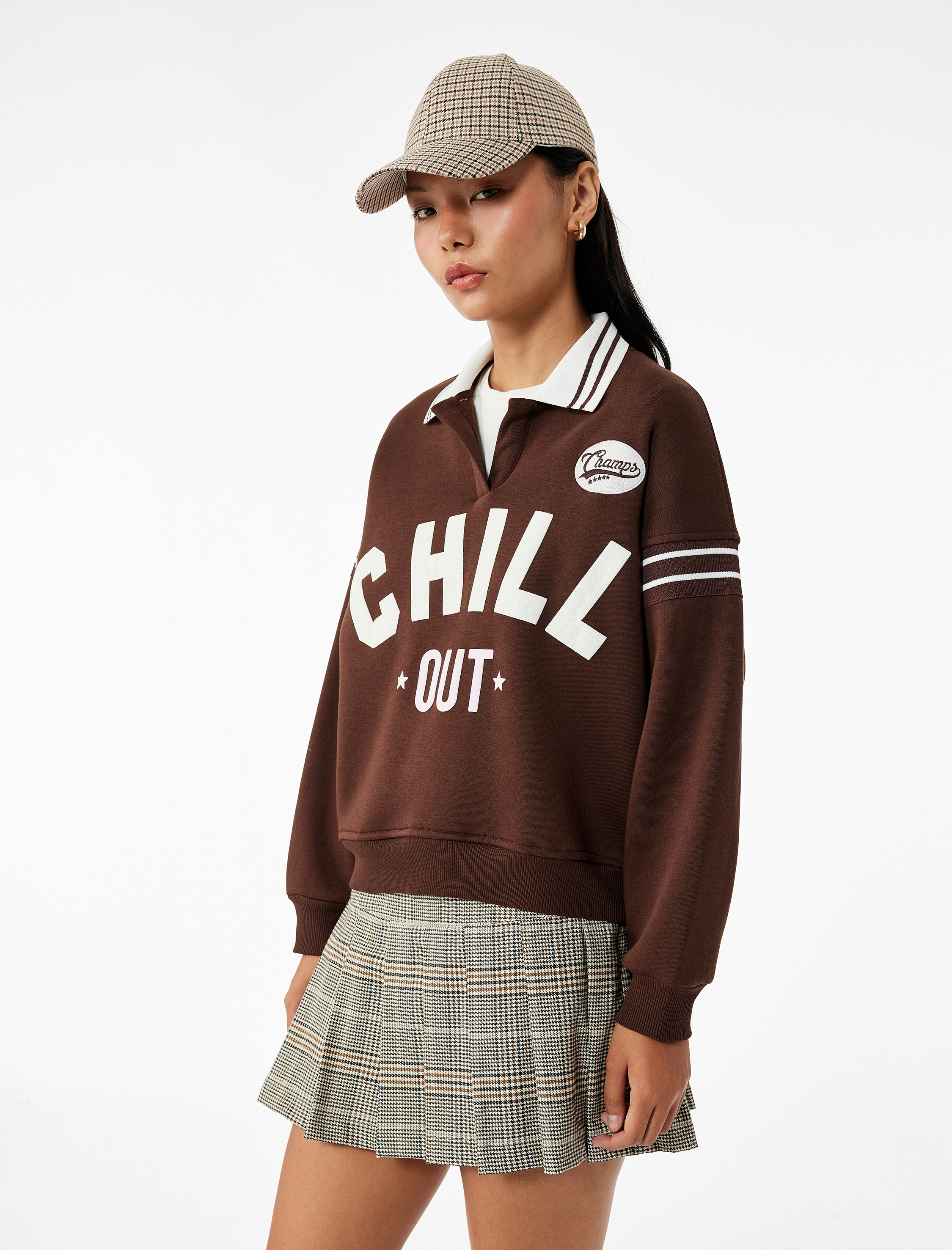 Üç İplik Şardonlu Uzun Kollu Baskılı Biyeli Oversize Polo Yaka Sweatshirt