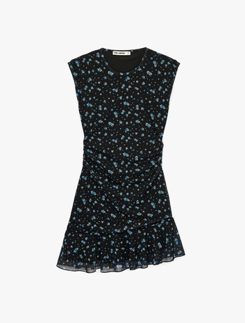 Asimetrik Kesim Kolsuz Bisiklet Yaka Büzgülü Kloş Tül Çiçekli Elbise