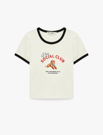 Pamuklu Kısa Kollu Biyeli Bisiklet Yaka Köpek Baskılı Tişört Sepete Ekle