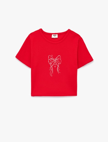 Kız Çocuk Fiyonk baskılı Bisiklet Yaka Kısa Kollu Kaşkorse Pamuklu Tişört