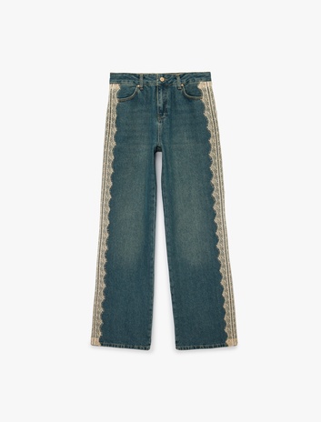 Dantel Detaylı Uzun Düz Paça Pamuklu Denim Pantolon - Straight Fit Jean Sepete Ekle