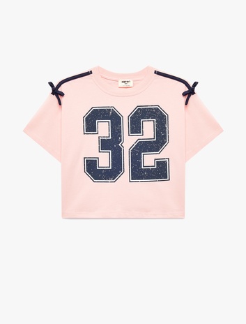 Pamuklu Kısa Kollu Fiyonk Detaylı Bisiklet Yaka Baskılı Tişört Sepete Ekle