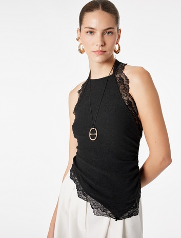 Bürümcük Kumaş Asimetrik Kesim Dantel Detaylı Halter Yaka Bluz