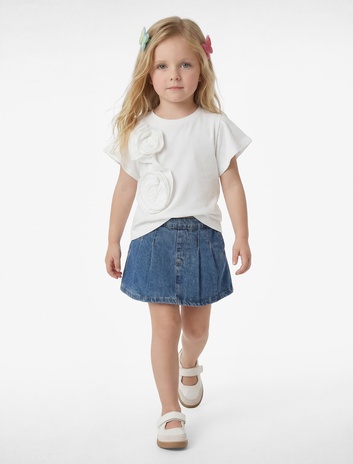 Kız Bebek Balon Kollu Çiçek Detaylı Kısa Kollu Pamuklu Tişört