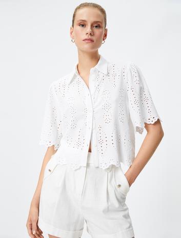 Oversize Gömlek Kısa Kollu Dokulu Cep Detaylı Düğmeli
