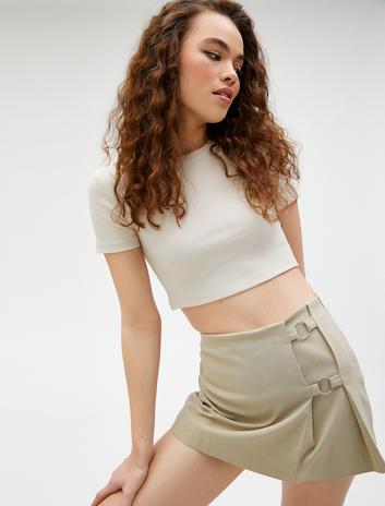 Crop Tişört Bisiklet Yaka Kısa Kollu Fitilli