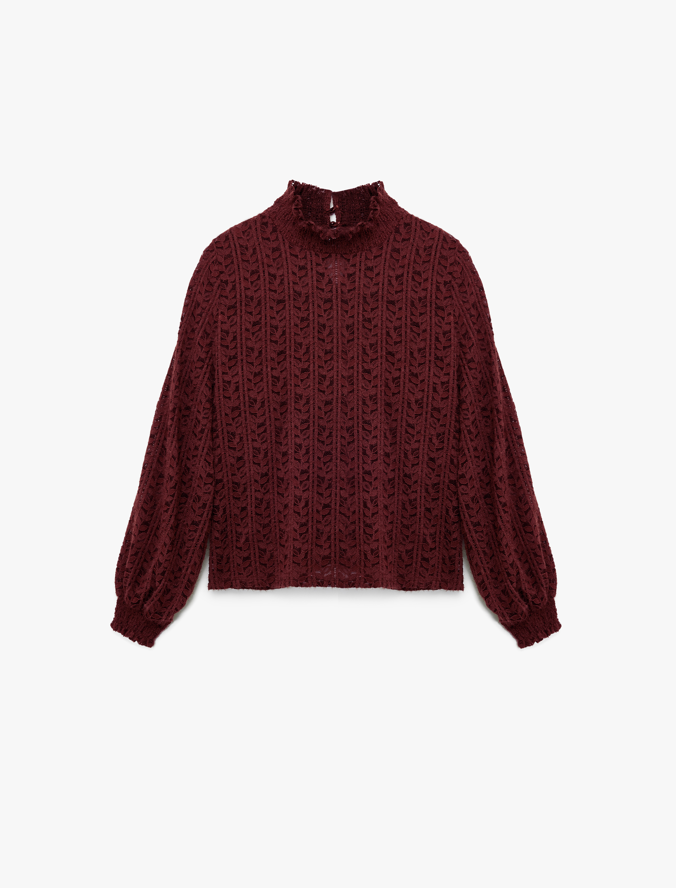 Uzun Balon Kollu Fırfırlı Dik Yaka Dantelli Bluz