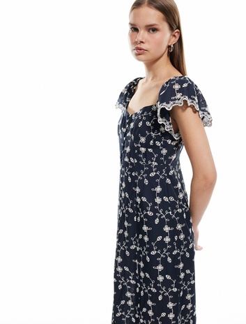 Çiçekli Kayık Yaka Omzu Açık Düğmeli Dantelli Uzun Elbise
