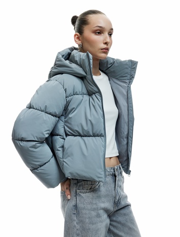 Dik Yaka Uzun Kollu Cepli Fermuarlı Su İtici Anorak Şişme Crop Ceket