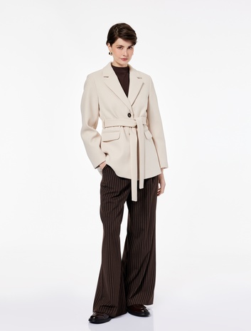 Uzun Kollu Cepli Kemer Detaylı Kruvaze Düğmeli Kısa Kaşe Mont
