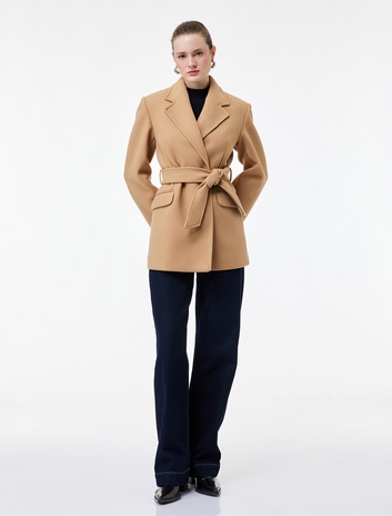 Kısa Kaban Kaşe Kemerli Cepli Kruvaze Uzun Kollu