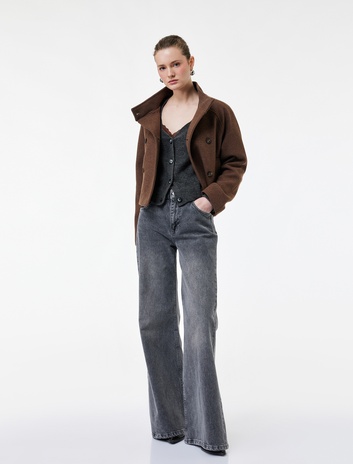 Uzun Kollu Cepli Dik Yaka Düğmeli Kruvaze Kısa Kaşe Mont