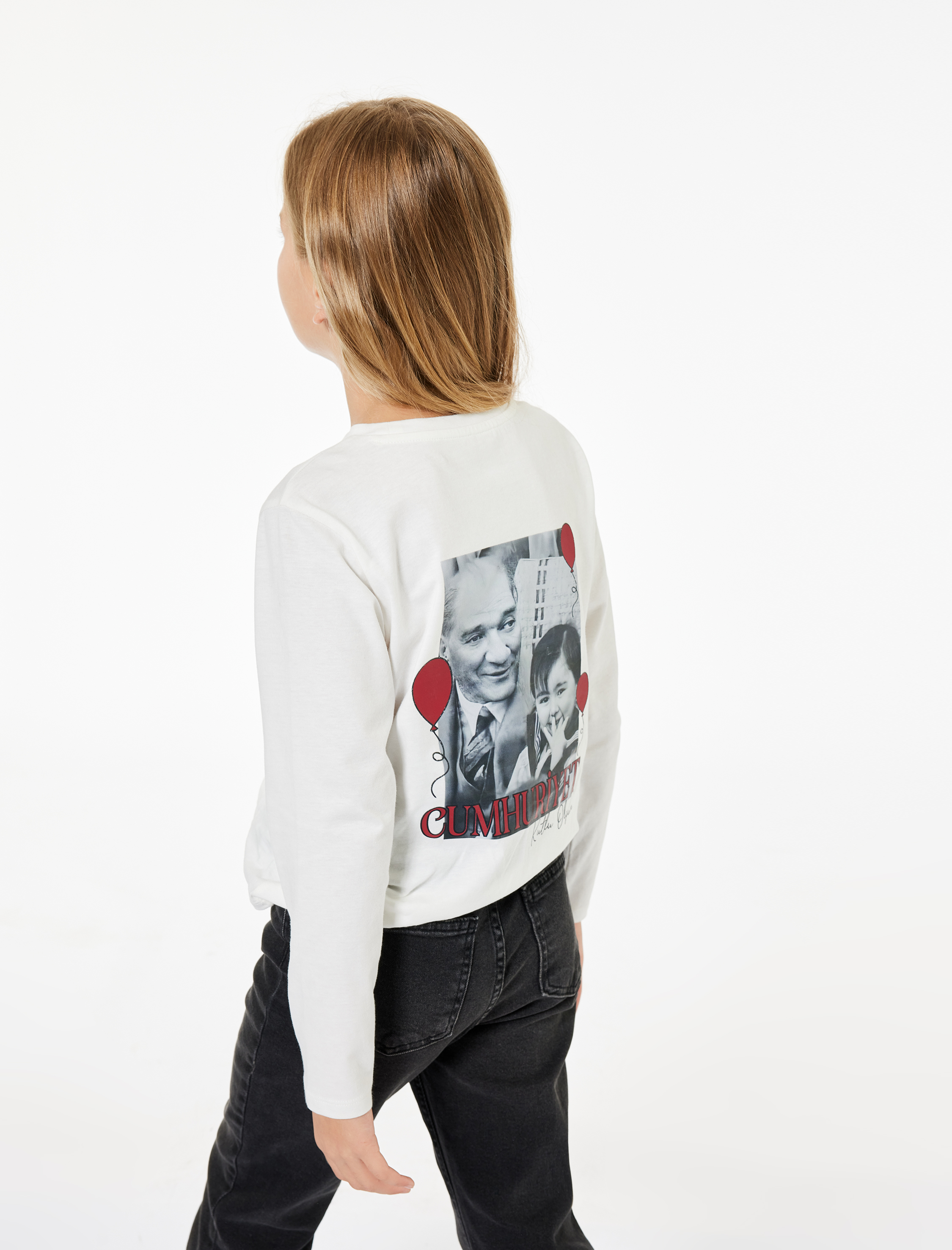 Kız Çocuk Uzun Kollu Bisiklet Yaka Pamuklu Atatürk ve Cumhuriyet Baskılı Tişört