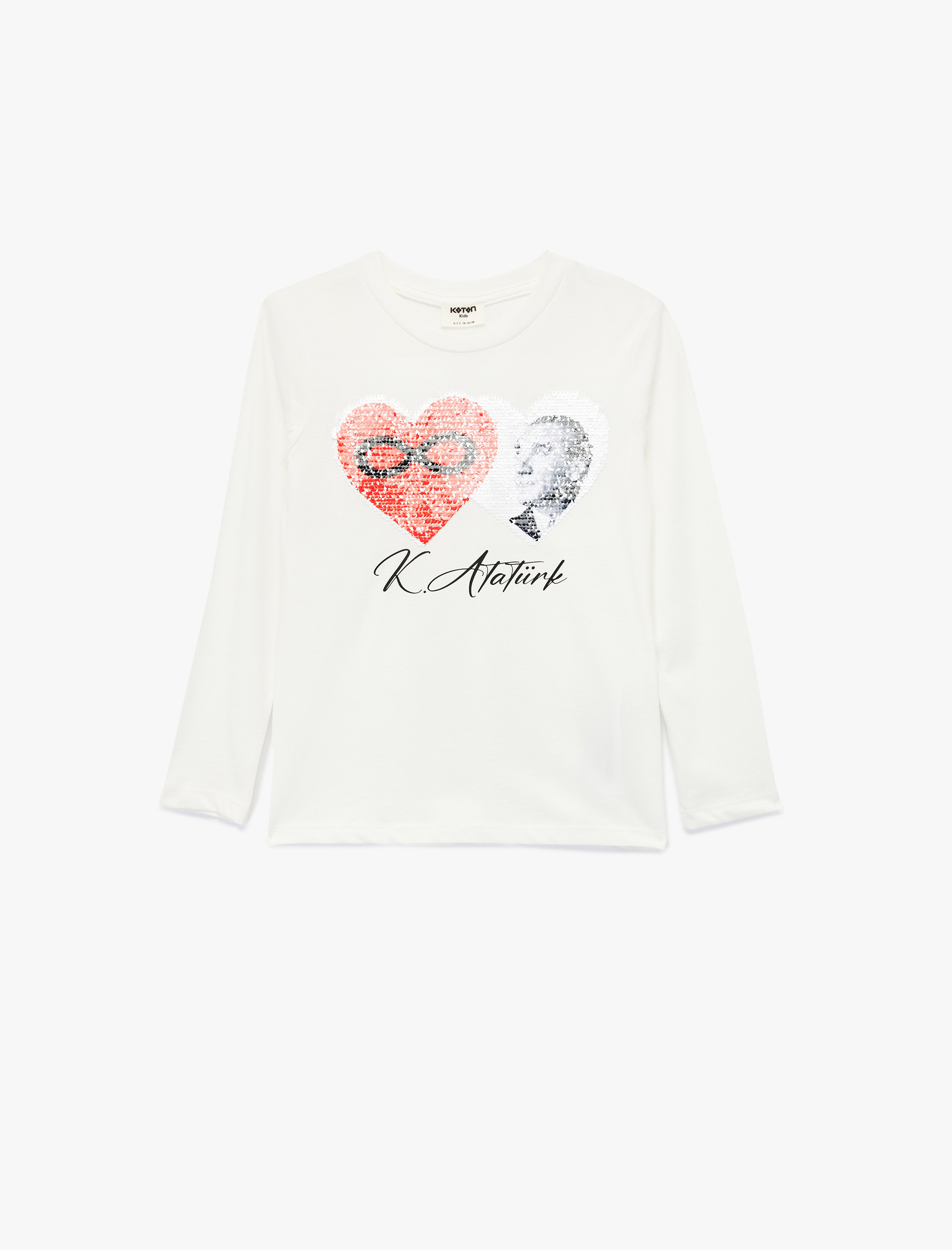 Kız Çocuk Uzun Kollu Bisiklet Yaka Pamuklu Pullu Payetli Atatürk Baskılı Tişört