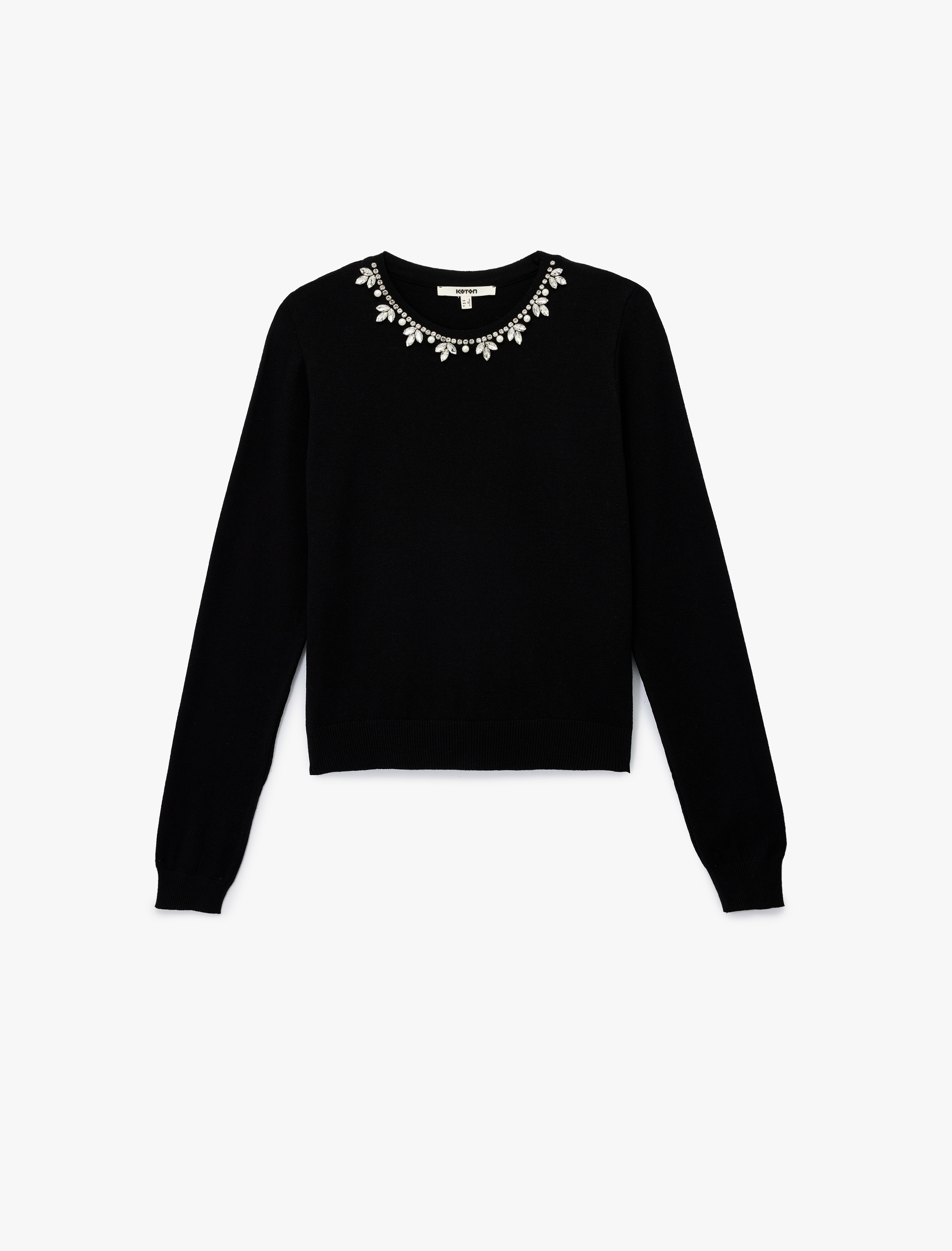 Uzun Kollu Bisiklet Yaka Taşlı Triko Kazak