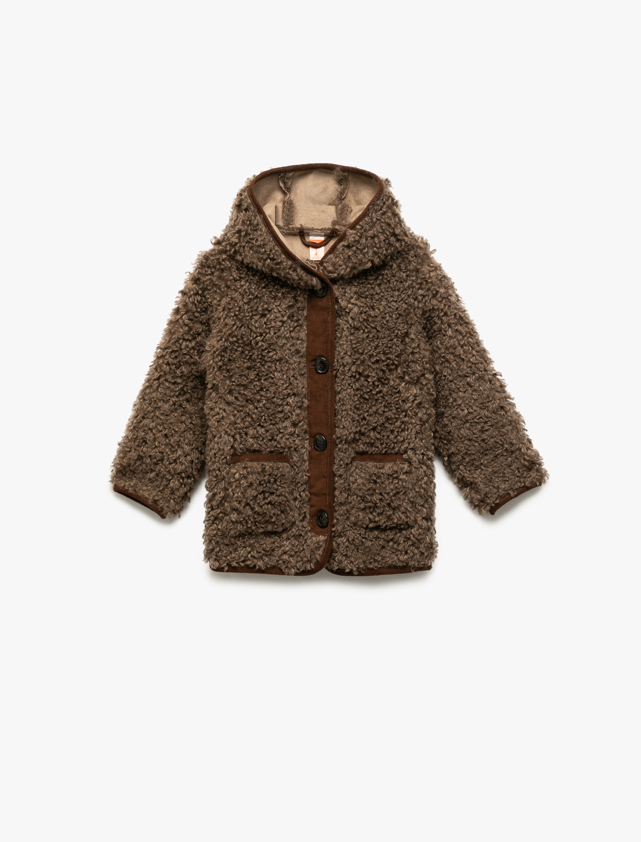 Kız Bebek Uzun Kollu Cep Detaylı Kapşonlu Peluş Mont