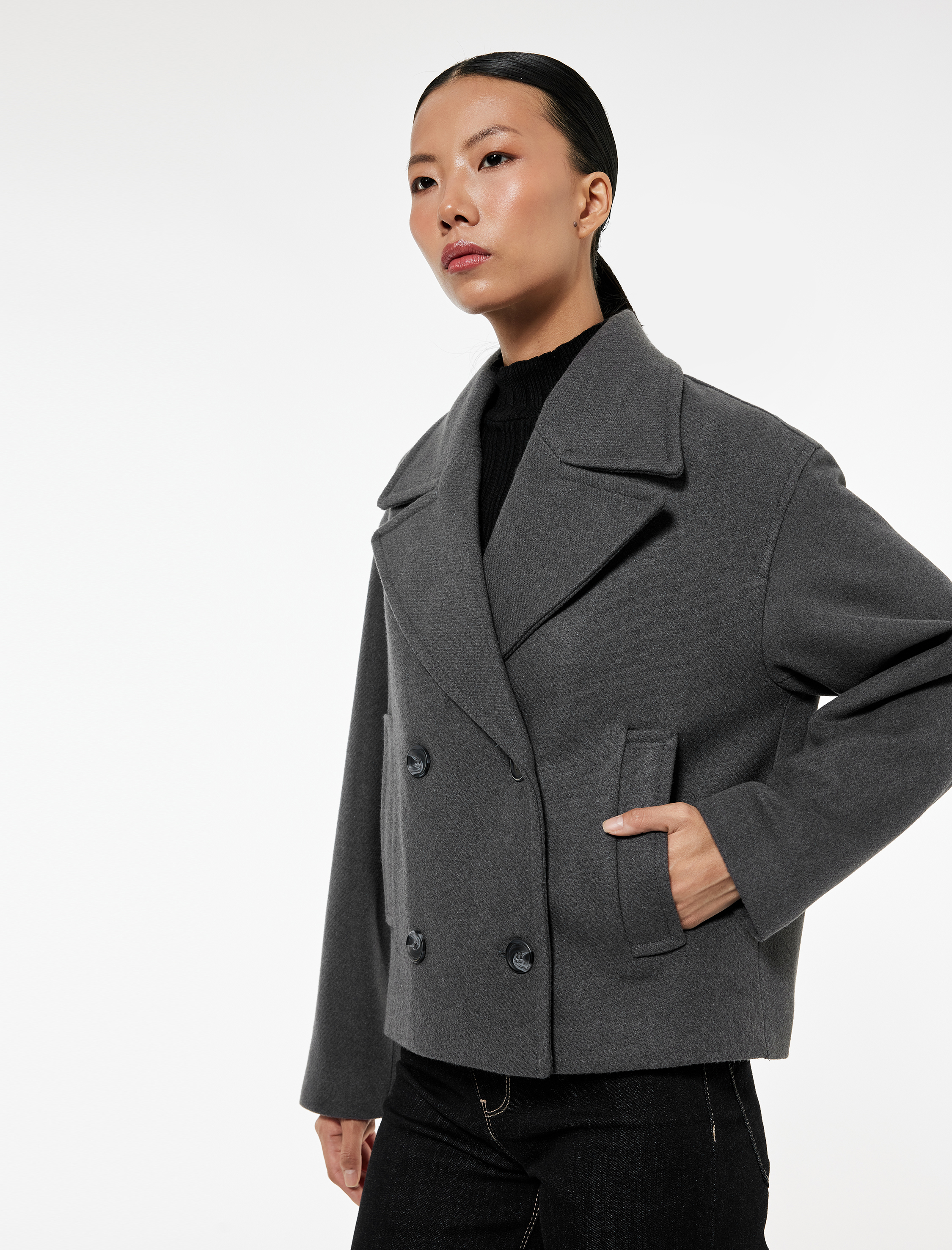 Uzun Kollu Cepli Düğmeli Kruvaze Kısa Kaşe Mont